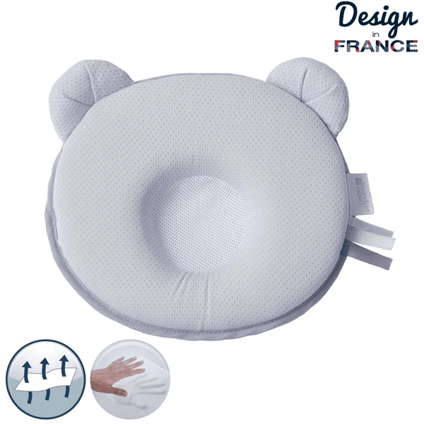 Un cojín para prevenir la deformación craneal, fabricado en suave espuma viscoelástica con tejido microperforado con malla insertada.
