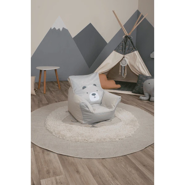 El relleno consiste en pequeñas bolas de poliestireno que se adaptan individualmente al cuerpo del niño. La funda tiene una cremallera de seguridad, se puede quitar y es lavable.