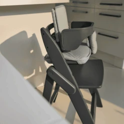 - El cojín del asiento y la almohadilla para la correa de la entrepierna también pueden fijarse a los respectivos elementos de la silla con un cierre de velcro para evitar que se deslicen o se caigan.