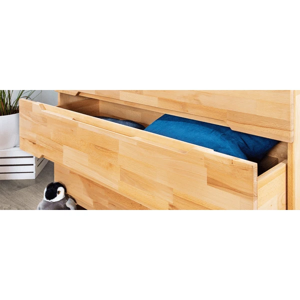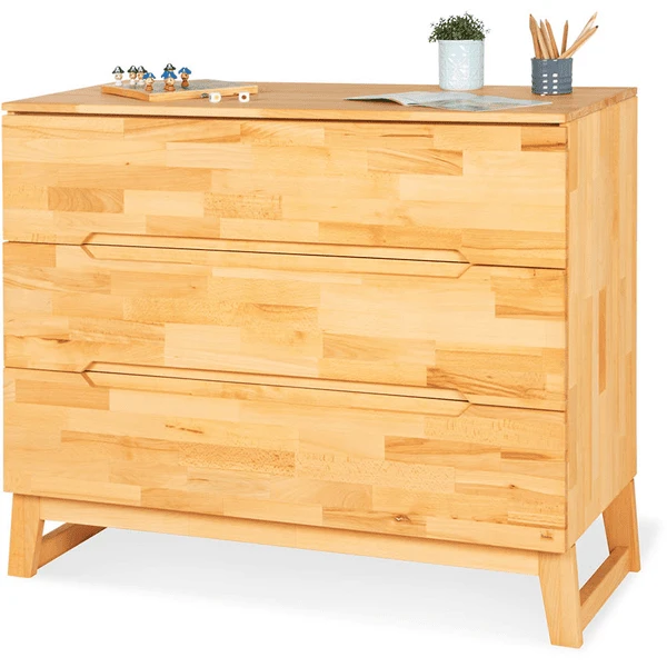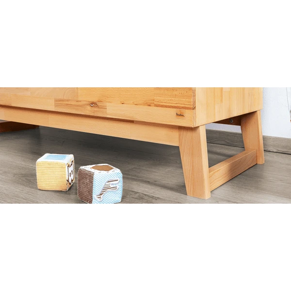La estructura de madera claramente visible y las empuñaduras fresadas empotradas llaman la atención en cualquier guardería. El cambiador puede montarse a la izquierda, a la derecha o en el centro, o puede retirarse por completo para crear un moderno lateral board . La amplia construcción y los tres grandes cajones aden proporcionan suficiente espacio para pañales, productos de cuidado y otros accesorios. Después de la hora del cambio de pañales, también se pueden guardar allí camisetas, pantalones o jerseys. Los cajones están equipados con el probado sistema Self-Soft-Close, que les permite cerrarse de forma segura y silenciosa. Los dedos de los niños pequeños también están protegidos de las desagradables magulladuras cuando ayudan a sacar los utensilios para cambiar los pañales.
