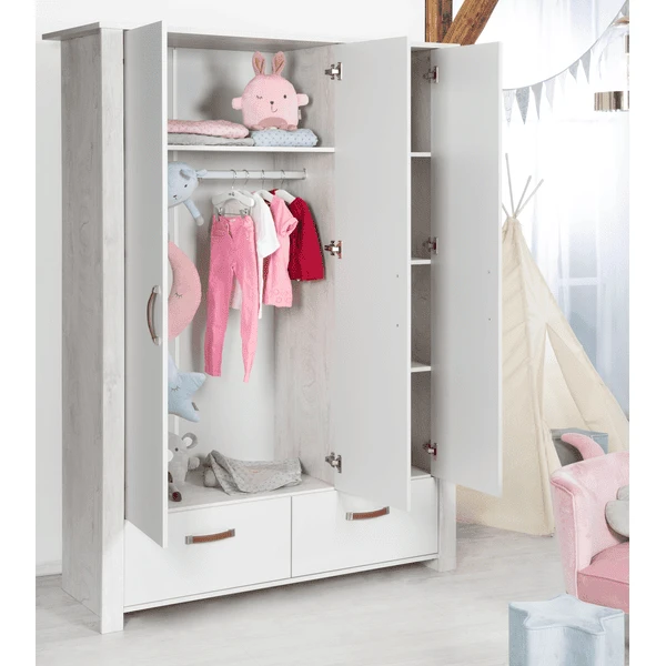 El armario de 3 puertas puede ampliarse perfectamente con otros muebles para bebés y niños de la serie «Mila» para crear una habitación de bebé o infantil completamente amueblada con muebles de sistema que crecen con el niño. El armario de la habitación del bebé está desarrollado en Alemania y es fácil de montar. Detalles del producto: