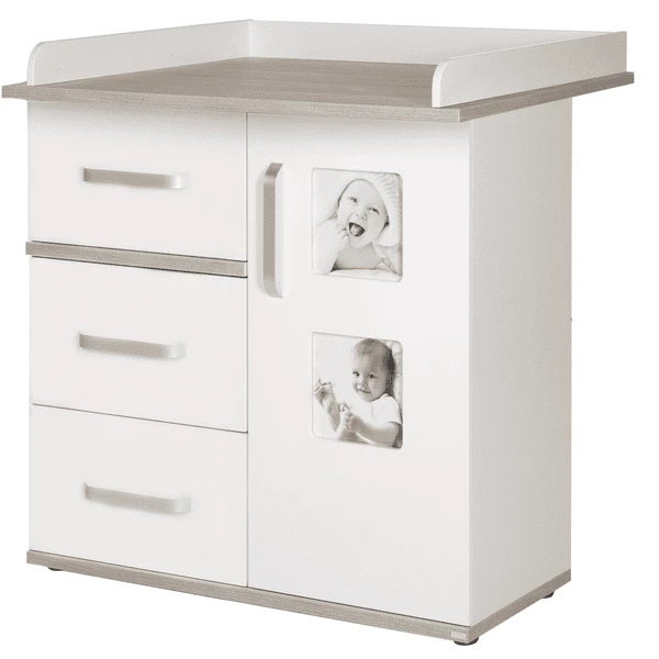 La decoración en blanco con elementos en «Luna Elm» son las características especiales de los muebles de la serie de habitaciones infantiles ROBA «Moritz». En esta habitación infantil, la decoración de modern e combina con los conocimientos técnicos. La tecnología de cierre suave de las puertas y los cajones aden forma parte del equipamiento de serie. Los marcos de fotos integrados en la puerta son un reclamo especial; cuando se colocan fotos personales, el cambiador se convierte en algo único. El cambiador «Moritz» también está equipado con un accesorio cambiador. Con un estante lateral disponible adicionalmente (accesorio), puede aprovechar al máximo el espacio debajo del cambiador.