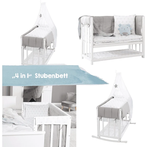 La roba Baby Sitter 4 en 1, «Stars & Dots» es una cama adicional a la de los padres, cuna, cama de bebé y banco infantil en uno. La cuna viene con un colchón de espuma, ropa de cama en un lindo diseño de Design «Stars & Dots», ticking, nido acolchado, dosel y barandilla de dosel, así como corredores para acunar. La cuna puede fijarse fácilmente y con seguridad a la cama de los padres con las correas suministradas y no puede deslizarse. Con un ajuste de altura sin escalas desde 42,5 cm hasta una altura ilimitada de la cama, incluidos los somieres, el moisés puede ajustarse de forma óptima a la altura del colchón de los padres y fijarse a la cama de éstos con una sujeción flexible e invisible. Mediante las guías incluidas, el moisés puede convertirse fácilmente en una cuna. Los tejidos diseñados con cariño en la página web Design «Stars & Dots» de la Babysitter 4 en 1 ofrecen un clima óptimo para dormir. La ropa de cama de 2 piezas consta de una almohada de 40×35 cm y un edredón de 80×80 cm. El edredón infantil está fabricado con un relleno de fibra climática transpirable y que equilibra la temperatura, de 100% poliéster. El tejido de la funda es de algodón 100%. El edredón puede utilizarse durante todo el año y es resistente y fácil de cuidar, ya que el acolchado evita que se deslice al lavarlo. La cuna 4 en 1 roba es adecuada desde el nacimiento y crece con el niño hasta convertirse en un banco infantil para niños mayores. El talento multifuncional también es fácil de montar (aproximadamente 30 minutos). El moisés, así como el equipo completo, ha sido probado y desarrollado por el TÜV y se ha fabricado con una barrera de seguridad de acuerdo con los últimos estándares de seguridad de la norma EN 1130:2019. Todos los materiales utilizados en el moisés 4 en 1 de roba Babysitter han sido probados en cuanto a sustancias nocivas, están certificados y son inspeccionados regularmente. El barniz utilizado es apto para alimentos y respetuoso con la piel. El moisés roba «Stars & Dots» con barras planas está lacado en color blanco. La superficie de reposo es de 90 x 45 cm. Dimensiones totales: altura con toldo 145 cm x anchura (sin/con guías) 50/76 cm x profundidad 95 cm.