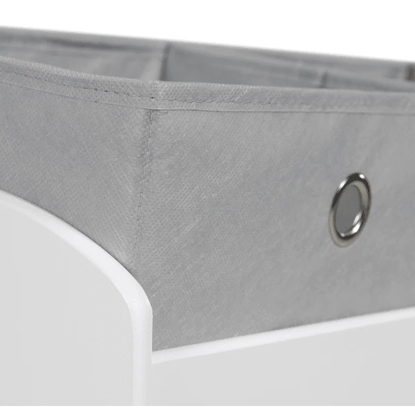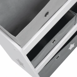 Gracias a las grandes asas en forma de Metal L, las cajas de tela se pueden retirar fácilmente y volver a colocar en el estante de juguetes. La caja de tela más baja y más grande está impresa con una estrella, que hace juego con el motivo de impresión de las partes laterales de la estantería. Con 5 cajas de tela.