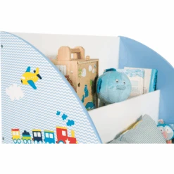 A los niños les encantará la estantería de juego azul con el elegante estampado de vehículos.