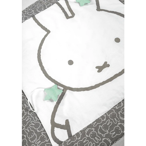 La manta miffy ® play and crawling con sus dos estrellas de tela para jugar es un regalo ideal para el nacimiento. El tejido exterior de la manta de roba juego y de arrastre está hecho de algodón duradero, la espalda está hecha de un 65 % de poliéster y un 35 % de algodón. La manta de juego y arrastre rellena de vellón de roba poliéster mide 100 x 100 cm, es lavable a máquina y rock apta para niños.