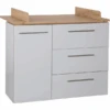 El cambiador de pañales blanco con panel superior en decoración Luna Elm está equipado con un elaborado fresado de casetes, asas de alta calidad Metal y tacos laterales.