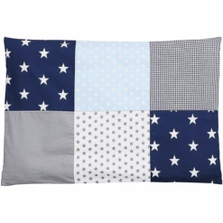 Para la ropa de cama infantil de alta calidad en diseño de parches, se cosieron a mano cuatro grandes parches con diferentes diseños para formar la funda de la ropa de cama. El dorso de la ropa de cama de los niños es liso con puntos sutiles. La práctica cremallera de plástico sin asa de empuje está oculta en almohadas y edredones. La funda de cojín de 40 x 60 cm también tiene un estilo mosaico en la parte delantera.