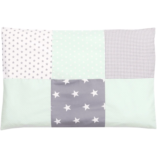 Para la ropa de cama infantil de alta calidad en diseño de parches, se cosieron a mano cuatro grandes parches con diferentes diseños para formar la funda de la ropa de cama. El dorso de la ropa de cama de los niños es liso con puntos sutiles. La práctica cremallera de plástico sin asa de empuje está oculta en almohadas y edredones. La funda de cojín de 40 x 60 cm también tiene un estilo mosaico en la parte delantera.